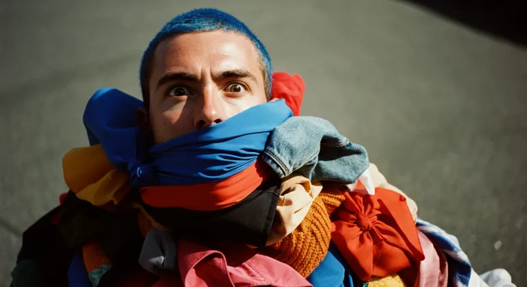 high angle daytime shot of man a man covered in colorful clothes. only man's face is visible. man is stuck in lots of clothes. man is gen z influencer. man looks surprised. man has blue buzzcut. daylight, creative shot