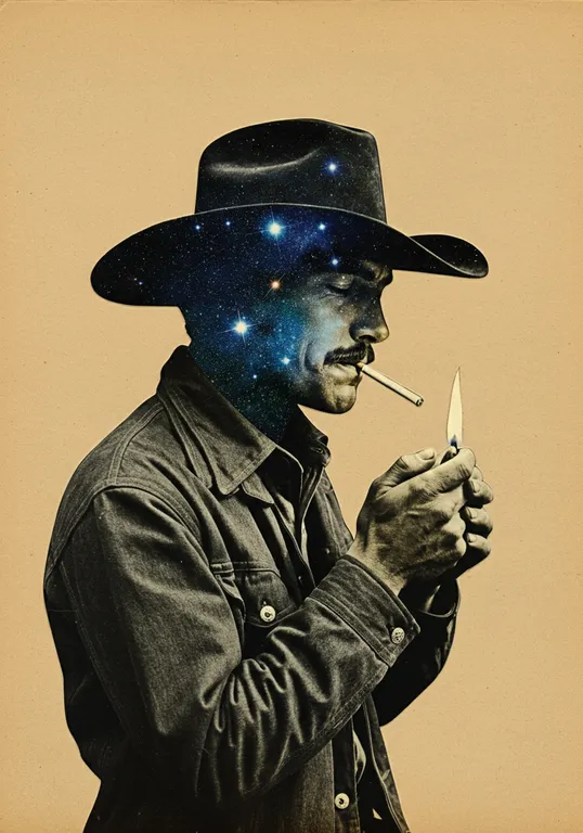 A surreal artwork featuring a cowboy lighting a cigarette. His cowboy hat is replaced by the night sky with space and stars merging into the background. The background is a flat, muted beige color