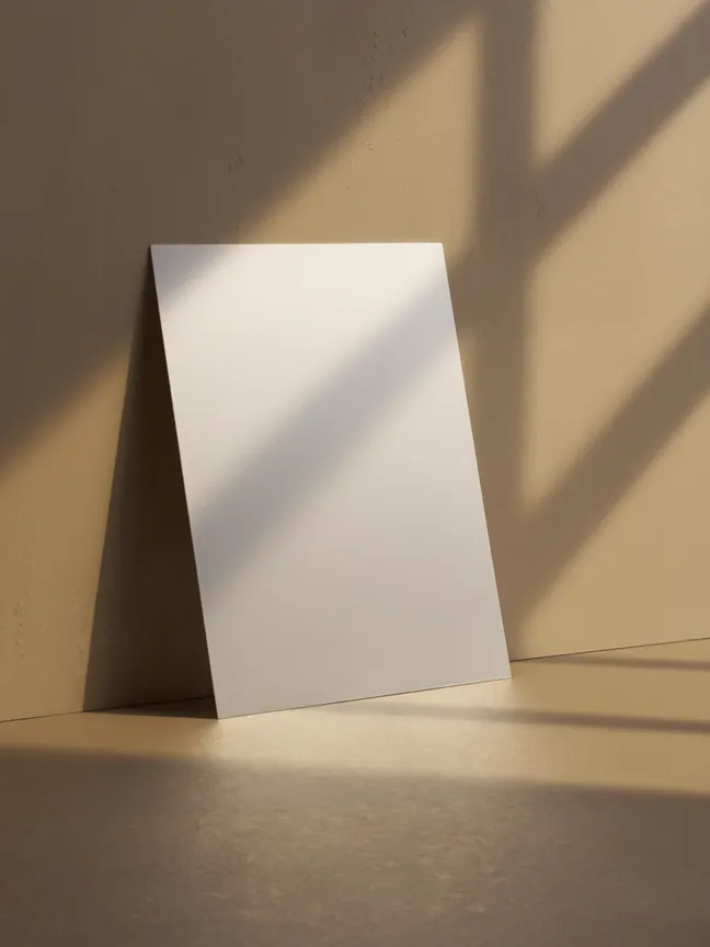 Create a highly photorealistic mockup featuring a blank silver postcard leaning against a wall. The scene should be minimalist, set against a neutral-toned background to emphasize a clean, sophisticated aesthetic. The lighting should be soft and natural, casting delicate shadows to highlight the texture of the wall and the surface beneath. Ensure the postcard remains plain to allow for easy customization, and capture a serene, modern vibe suitable for showcasing artwork, handwritten notes, or personalized messages.