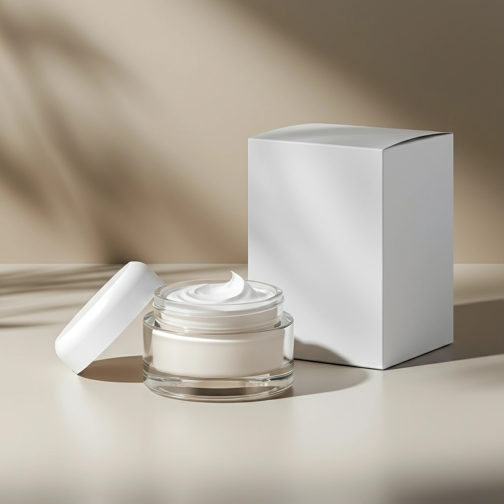 High quality photograph of a round glass packaging, its interior with white cream, next to it a white box, without labels, perfectly square and larger. A white, round lid draped over the side of the glass, proportional to the size of the glass surface. Environment: the objects are on a white surface, with a sophisticated and minimalist background, with soft shadows around them, highlighting the products. The photo angle focuses on objects with precise details. The background is neutral, with light shadows.