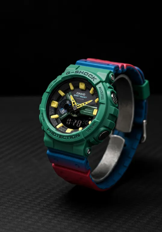 "A colorful Casio G-Shock watch with a bold, playful design featuring a green bezel, yellow watch face, and red accents. The strap is a gradient mix of blue and red, with perforated patterns. The digital display shows time and date functionalities. The background is a simple, dark carbon gray, allowing the vibrant colors of the watch to stand out. The image is captured from a slight side angle, highlighting the watch's robust and dynamic build, with even and clear lighting that emphasizes the clean, modern aesthetic of the design."