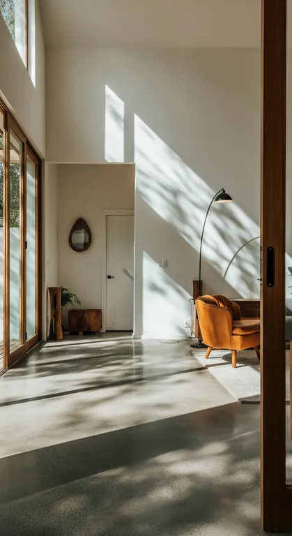 A minimalist, modern living room in a luxurious house, viewed from inside the house. We see the large floor-to-ceiling glass sliding door. We see a polished concrete floor in a warm interior with wooden elements and accessories, contemporary furnishings rest against clean, white walls softly illuminated by natural daylight. Shadows from nearby trees subtly pattern the walls, enhancing the serene ambiance. The light is bright yet gentle, suggesting late afternoon. The overall composition captures a harmonious blend of nature and sophisticated architecture, evoking a tranquil and inviting mood.
