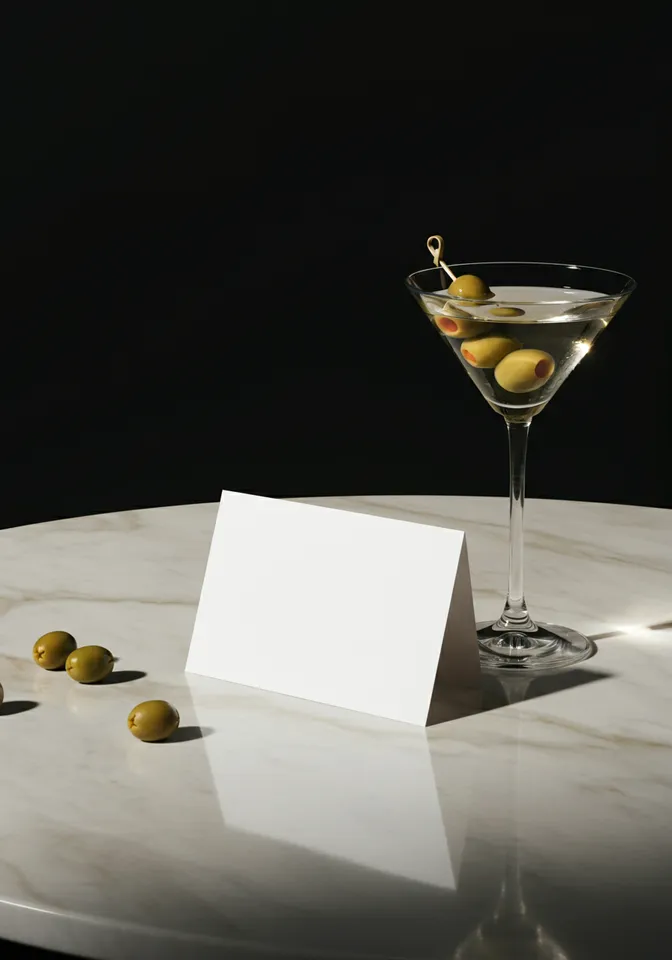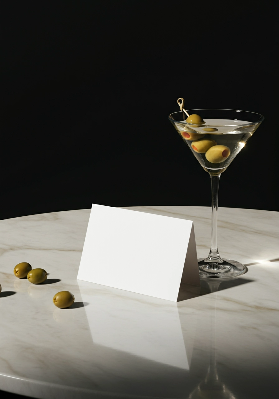 A stylish and elegant scene captured from a high-angle perspective, focusing on a white and elegant card placed on a marble table near its robust rounded corner. The card is blank, with no text, and slightly tilted. A classic martini glass with a clear cocktail and an olive garnish sits nearby, casting a soft shadow. Three green olives are scattered on the table, adding a touch of refinement. The lighting is warm and moody, with subtle reflections enhancing the luxurious and sophisticated atmosphere.