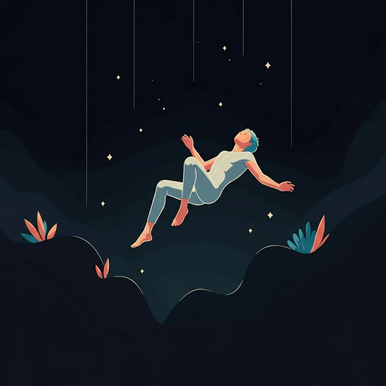 Une silhouette humaine flottant au milieu d'un fond noir infini, suspendue en apesanteur. Le corps est allongé, les bras écartés, évoquant une posture de calme et d’abandon. La figure semble défier les lois de la gravité, comme une âme éthérée, paisible et immobile. De petites étoiles scintillent faiblement dans l'obscurité environnante, accentuant la profondeur du vide. Une lumière douce baigne délicatement la silhouette, créant un subtil contraste entre la forme illuminée et le néant environnant, insufflant un sentiment de sérénité et de liberté dans ce moment suspendu hors du temps.