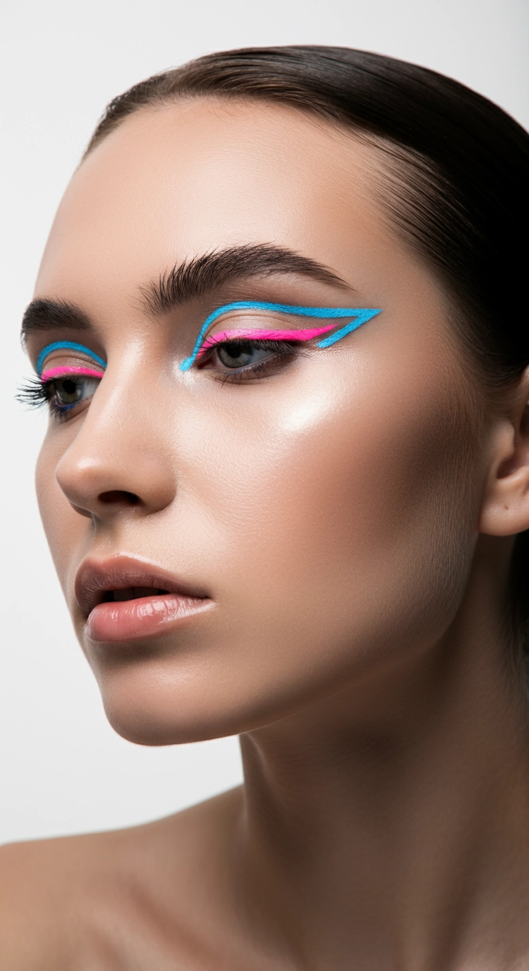 A clean beauty shot highlighting a modern makeup design with sharp, minimalistic neon eyeliner in vibrant blue and pink tones. The neon lines form geometric shapes around the eyes, creating a sleek and artistic look. The skin is smooth and glowing with a natural finish, while the background is pure white to emphasize the vivid colors. The style is modern, fresh, and photorealistic, perfect for a high-end beauty campaign