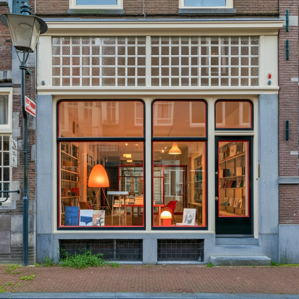 Modern and quaint concept store-front in Amsterdam featuring large windows adorned with intricate lattice patterns, free of any objects by the window. Muted colors dominate the scene, with bright daylight illuminating the details. The composition is frontal and symmetrical, focusing on the concept store's inviting and historical atmosphere, conveying a sense of modernism and warmth. The interior, visible through the glass, has red accents and hints of contemporary furniture and designer books.