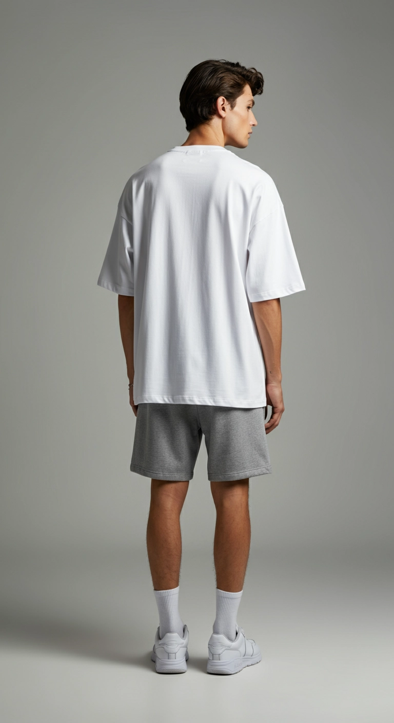 A male model standing in a minimal studio setting with a clean gray background, wearing a white oversized T-shirt and gray shorts. The model is positioned with his back slightly turned to the camera, showcasing the relaxed fit of the T-shirt and the casual style of the outfit. He is also wearing white socks and white sneakers, completing the minimalist and modern streetwear look. The lighting is soft and evenly distributed, emphasizing the textures and colors of the clothing without harsh shadows. The overall mood is simple and clean, focusing on the casual and contemporary aesthetic.