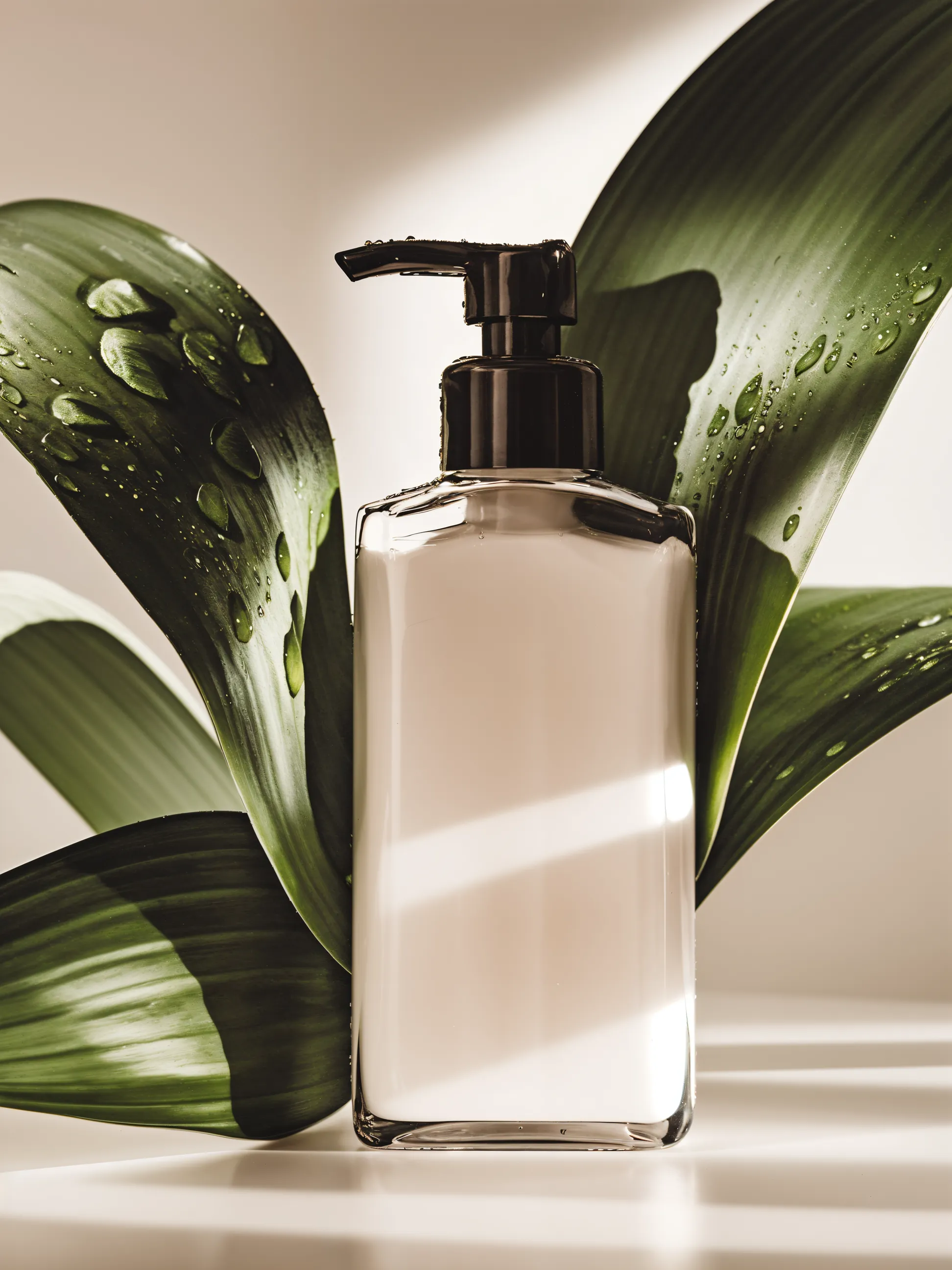 A larger minimalist rectangular semi-opaque glass bottle with white facial cleanser inside, featuring a slim black metal pump top, stands elegantly amidst two large, curved green leaves with dew droplets, suggesting freshness and vitality. The leaves wrap around the bottle, creating a dynamic composition that emphasizes nature. The background is minimal and softly illuminated, enhancing the pristine and crisp look of the product. The lighting creates subtle shadows, adding depth and focus on the bottle. The arrangement conveys a sense of purity and sophistication, with a serene and refreshing mood, without any label, just a plain bottle with no round corners.