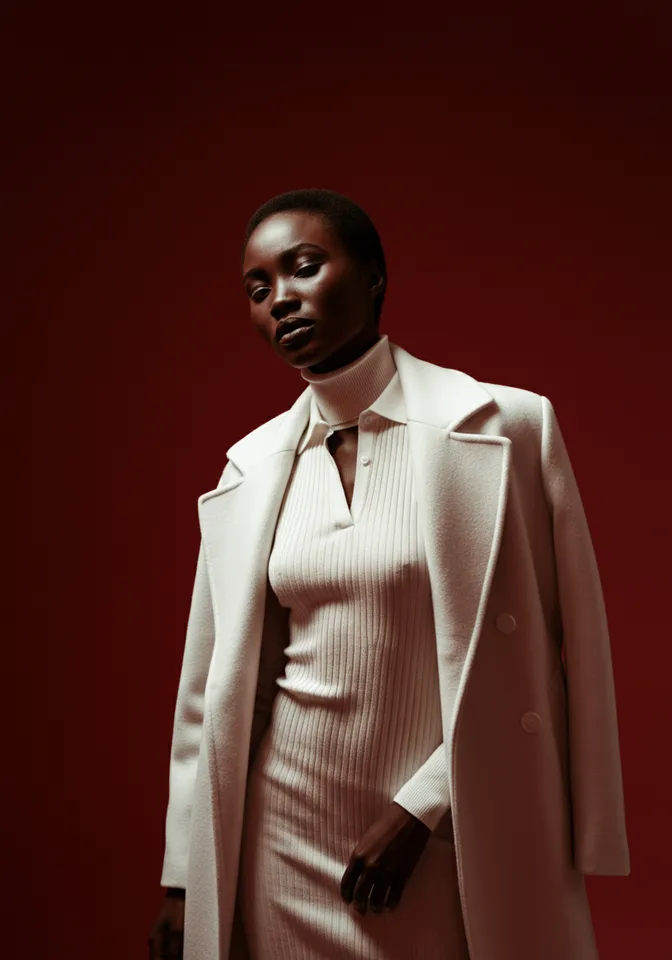 high fashion female African model in studio against a red background, in a white color polo neck dress and coat. Very soft upper light.