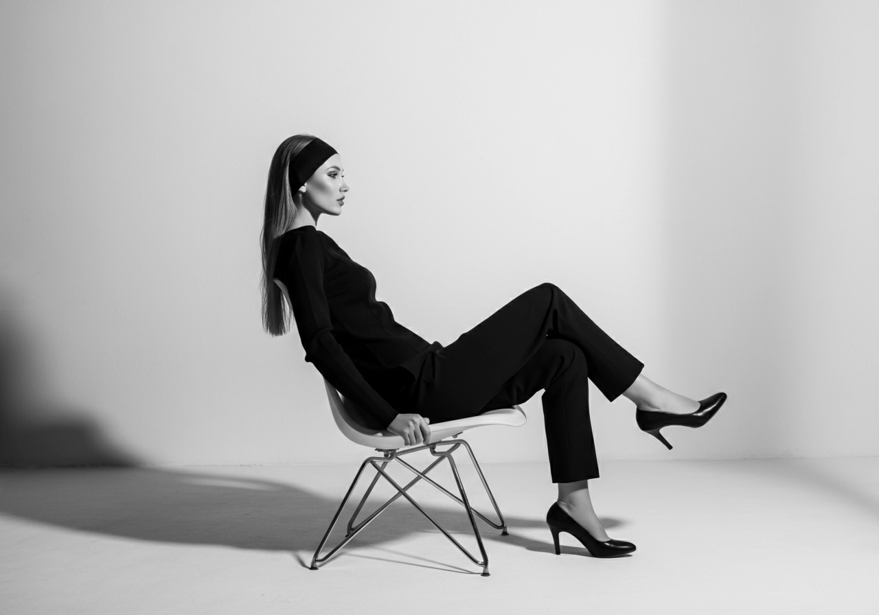 A woman sits in a modernist chair from the 60's, wearing a sleek, form-fitting black outfit with a black headband. Her hair is loose. Her pose is relaxed yet dynamic, with one leg propped against a wall, showcasing a sense of casual elegance. The setting is minimalistic, featuring a plain background with subtle shadows. The monochromatic palette and soft lighting contribute to a timeless, sophisticated atmosphere. The composition is side-view, focusing on her poised expression and stylish posture, creating an iconic, artistic mood. She is facing to the left.