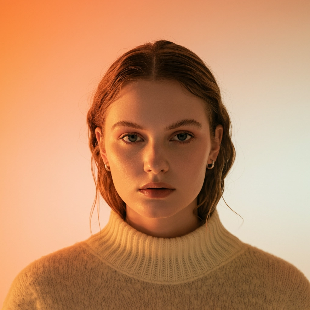 A young Caucasian woman looking at the camera on a light gradient background of orange to white. The orange background is reflecting on her skin and hair. Her hair is soft and braided.