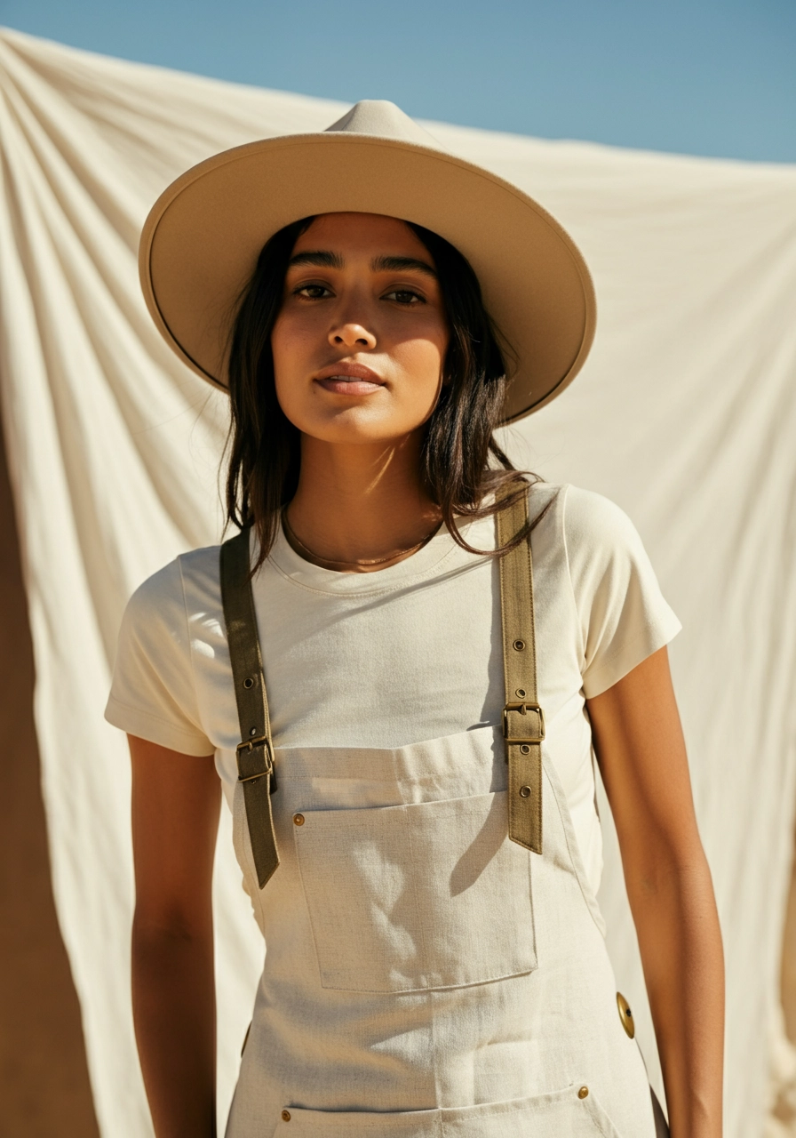 A tan model wearing a cream short sleeve cotton t-shirt and a cream linen apron with khaki straps and thin brass buckles. She is standing outside in the desert. The camera is focused on the model's face and her hat. Her hair color is dark brown. The model is looking at the camera. and the sunlight is position to the left of the model. make the background clear