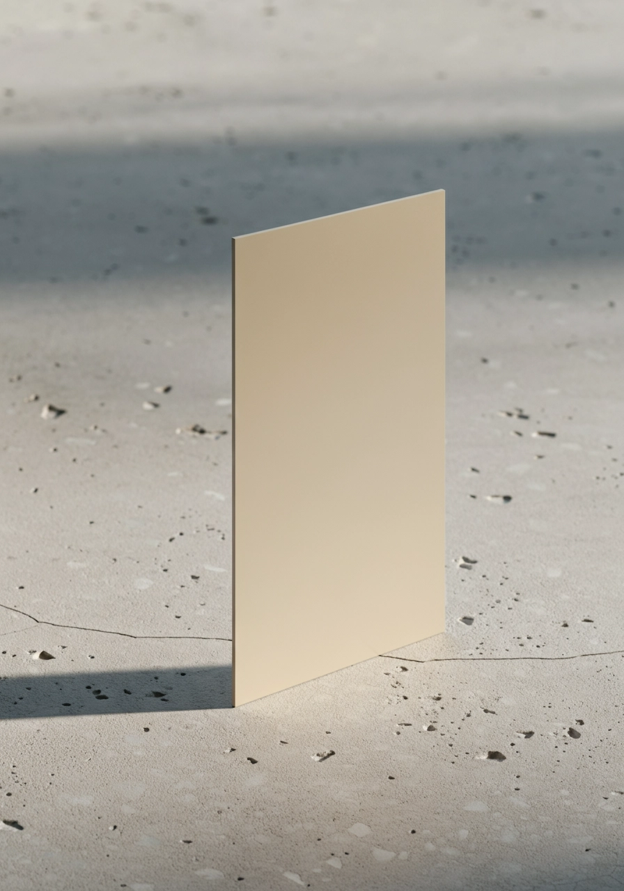 Generate an image of a minimalist steel rectangle cream-colored on a textured, light concrete surface with visible cracks and speckles at sunset time. The steel rectangle is matt and quite thin and it's standing up vertically. Use soft, natural sunset lighting to cast gentle shadows, emphasizing the textures of both the containers and the concrete surface. The overall style should be elegant and minimalist, with a focus on neutral tones and simple shapes.