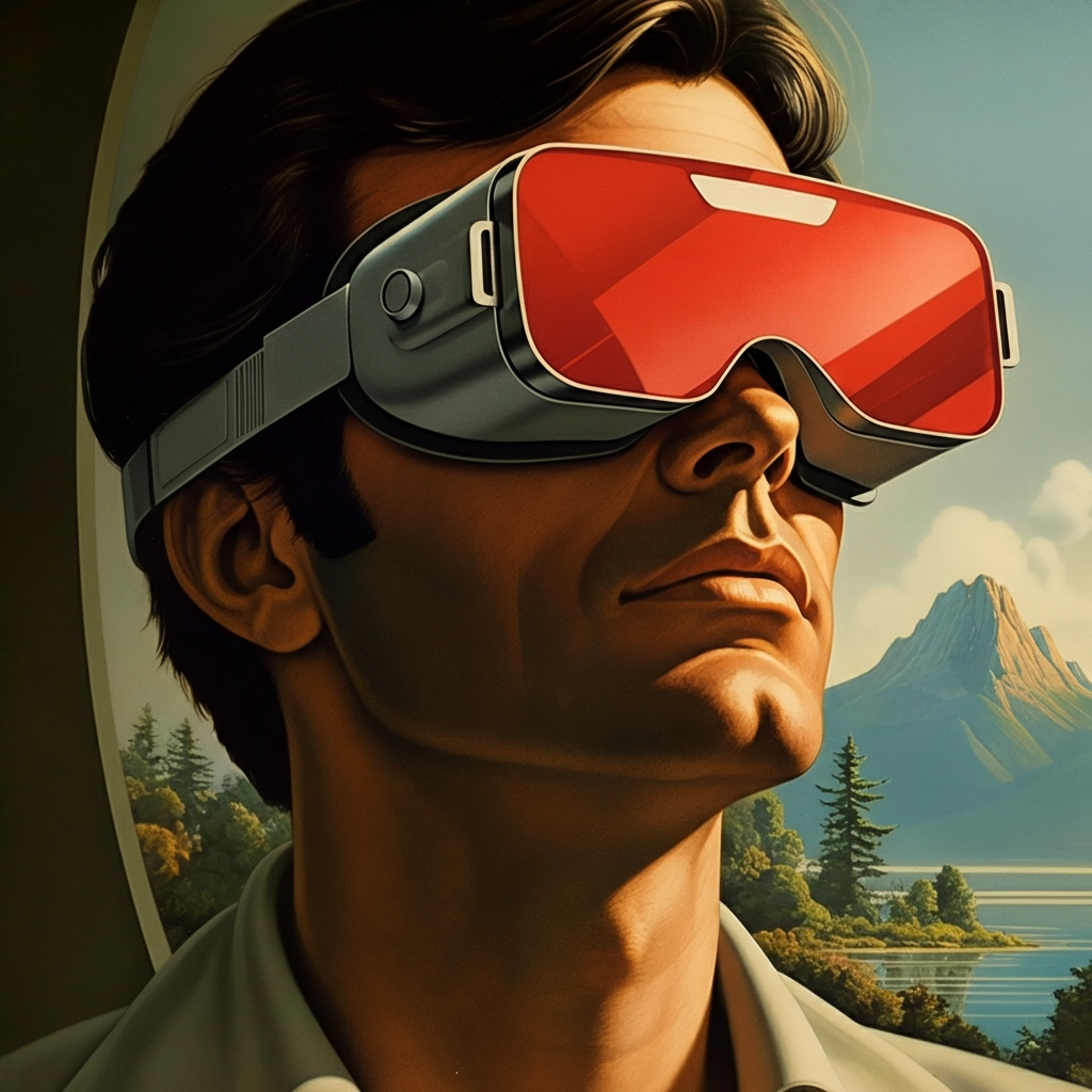 A painting of a close-up shot of a man wearing red VR glasses. The man is sitting in a serene environment with a peaceful scenery. The background contains a picturesque landscape with mountains, trees, and a body of water. The lighting is soft. The overall image has a contemplative mood and a dreamy atmosphere.
