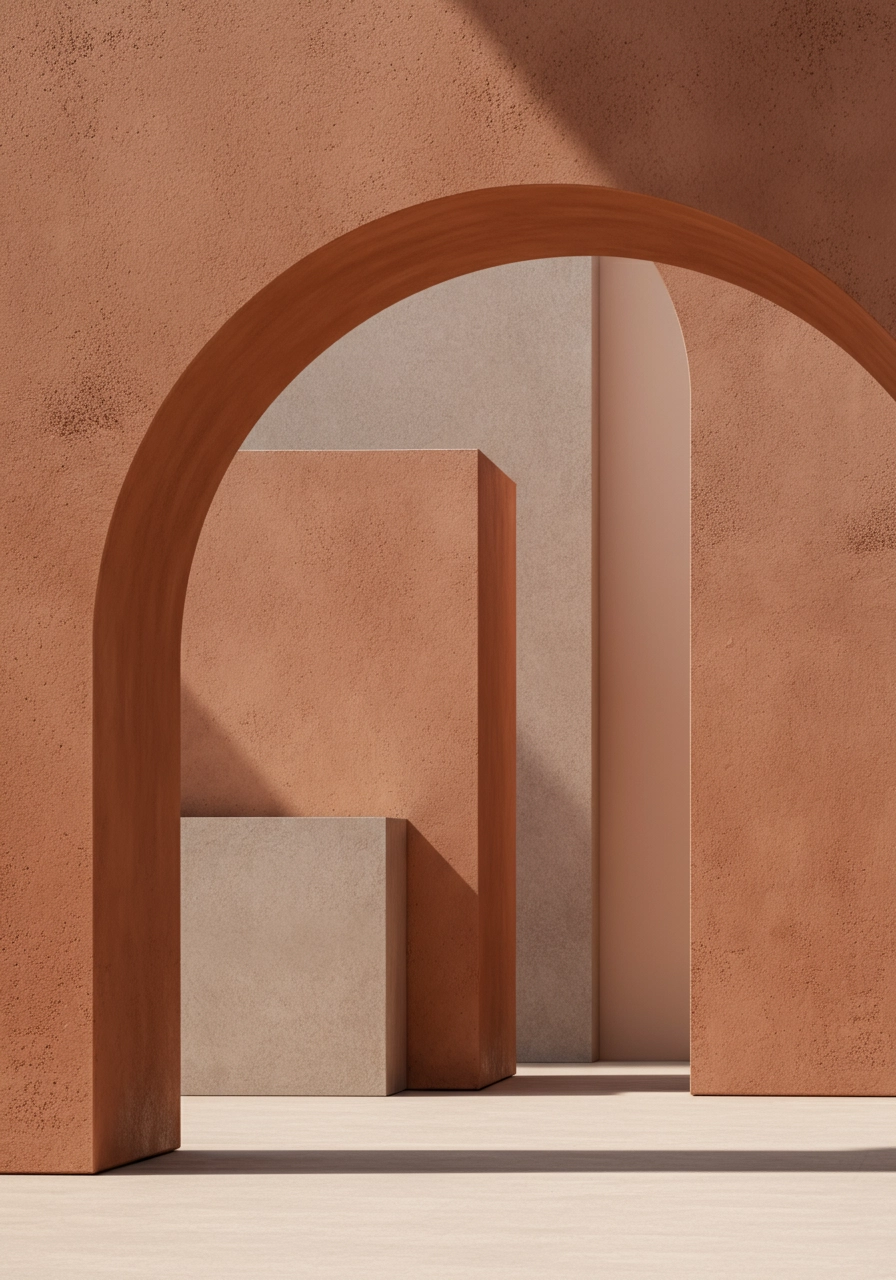 A minimalist architectural scene featuring a textured, terracota concrete structure with sharp lines and an arched opening. The background reveals additional architectural elements, creating a sense of depth and perspective. The dominant color is a warm, muted pink, enhanced by natural sunlight casting soft shadows. The composition emphasizes geometric simplicity, with clean lines and a focus on the interplay of light and shadow, evoking a serene and contemplative atmosphere.