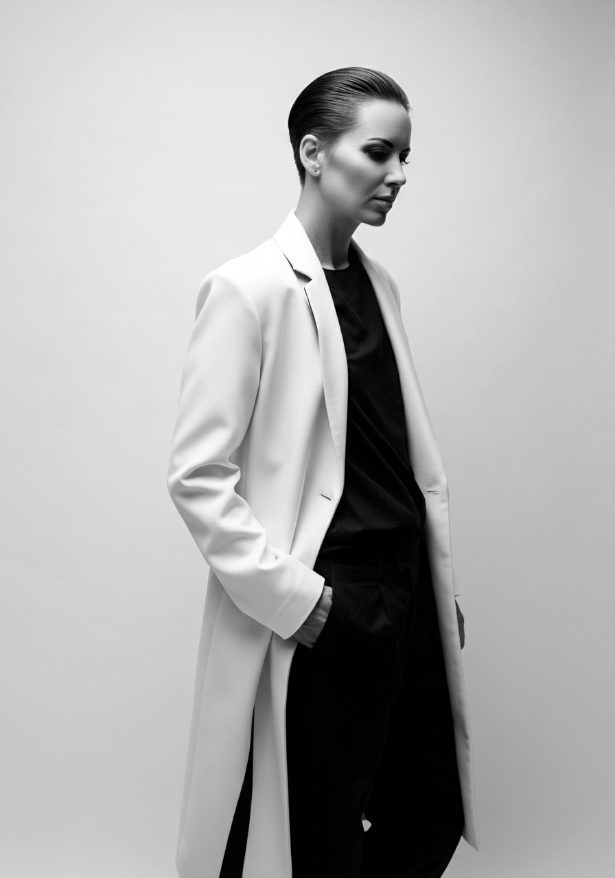 A person with a contemplative expression stands in a minimalist setting, wearing a long, stylish white coat over a black outfit. The coat features a contrast black inner lapel, adding elegance to the look. The person has short, slicked-back hair and stands with one hand in their pocket, exuding a sense of calm and sophistication. The background is a plain white, further emphasizing the clean and modern aesthetic. The image is in black and white, with balanced lighting creating soft shadows, enhancing the monochromatic theme and giving a serene and sophisticated atmosphere.