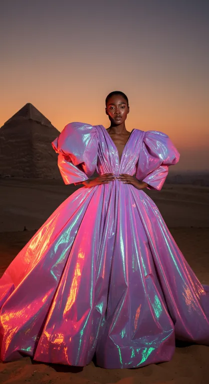 A high-fashion editorial shot captures a stunning female model of African descent with a glowing, warm, caramel complexion. Her sleek, jet-black hair is styled in a low bun, with delicate tendrils framing her face, enhancing her natural beauty. The model’s makeup is soft and minimalist, featuring subtle contouring that highlights her sharp cheekbones, a soft nude lip gloss that enhances her full lips, and perfectly arched brows. Her eyes are gently highlighted with a natural shimmer, and her skin radiates under the soft, golden lighting. She is posed in a desert at sunset, wearing a futuristic, holographic gown that emits a soft, iridescent glow in shades of pink, purple, and blue. The voluminous gown, featuring oversized puff sleeves and cascading layers, catches the light from the setting sun, creating a stunning interplay of colors on the holographic material. The desert backdrop features the iconic pyramids in silhouette, adding a sense of grandeur to the scene, while the model’s serene yet confident expression exudes elegance and sophistication. The lighting is soft and golden, casting gentle highlights on the model’s face and gown, creating a warm, ethereal glow. The desert sunset bathes the scene in hues of orange and lavender, while the holographic gown reflects the light, amplifying the surreal and futuristic feel of the image. The entire composition blends ancient history with modern, avant-garde fashion. The shot is captured using a 50mm lens, ensuring that both the model and the desert landscape are in sharp focus. The soft lighting emphasizes the smoothness of the model’s skin, while the glowing gown takes on an almost otherworldly appearance against the vast desert backdrop.