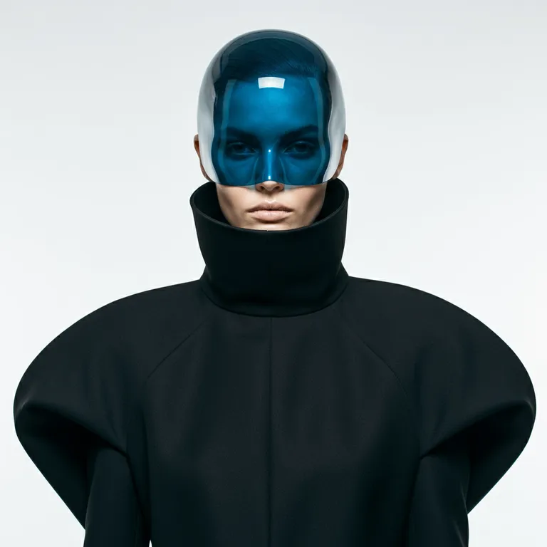 Futuristic fashion model wearing a sleek, high-collared black outfit with large, exaggerated rounded shoulders. The model's face is covered with a smooth, metallic blue mask that blends seamlessly with the face, giving a bold, avant-garde look. The overall design is minimalistic, emphasizing clean lines and a surreal, almost alien aesthetic. The lighting is soft and the background is plain white, highlighting the dramatic shapes and textures of the outfit and mask." This prompt emphasizes the key visual elements such as the futuristic, exaggerated fashion design and the mask, which are essential to the image.