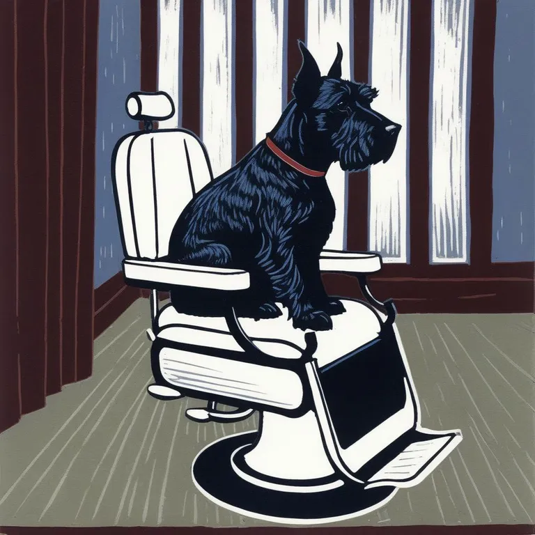 a scottish terrier sits in a barber's chair, awaiting a haircut