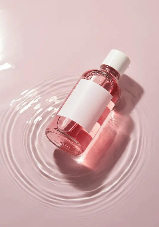 High-angle photo of a transparent glass cosmetic bottle with a blank label, filled with pink liquid. The bottle is placed on a soft, rippling water surface, with light reflections creating wavy patterns around it. Soft, diffused overhead lighting highlights the pink color of the liquid and adds a clean, minimalist aesthetic. Background in light pink tones to enhance the relaxing and luxurious feel