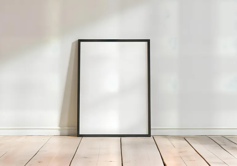 An empty 8x10 frame in black is leaning up against a white wall. The frame rests on a wooden parquet floor within a simple, well-lit room with neutral-toned walls. The light casts a soft shadow on the wall, contributing to a calm and airy atmosphere. The composition is centered and the angle is front-facing, highlighting the minimal and modern vibe of the photo. This is a photo for a mockup. Its ultra realistic and is a photograph shot on a DSLR camera.