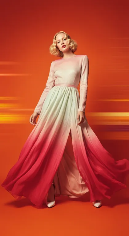 A fashion advertisement featuring the model wearing an elegant, shimmering pink and white gradient dress with long sleeves. She stands on a vibrant orange background with blurred speed lines in shades of red and yellow, creating a dynamic effect that highlights the elegance of her figure. adding to its sleek design in the style of Annie Leibovitz. --ar 3:4 --v 6.1