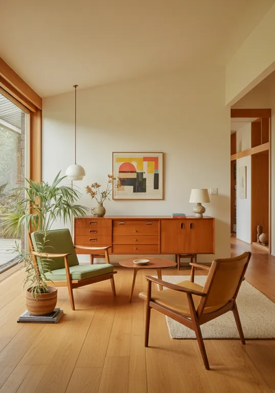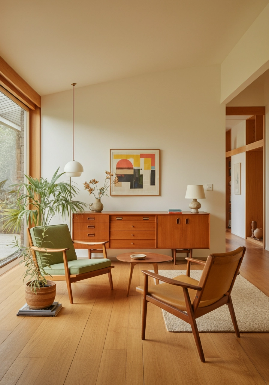 Minimalist room, wood floor, natural light from the outside, in the style of Faeron hay nz architects, this scene embodies minimalism's focus on clean lines, open spaces, and natural elements, minimal mid century furniture, shot taken with Leica M6. The perspective is front-facing showcasing the entire space