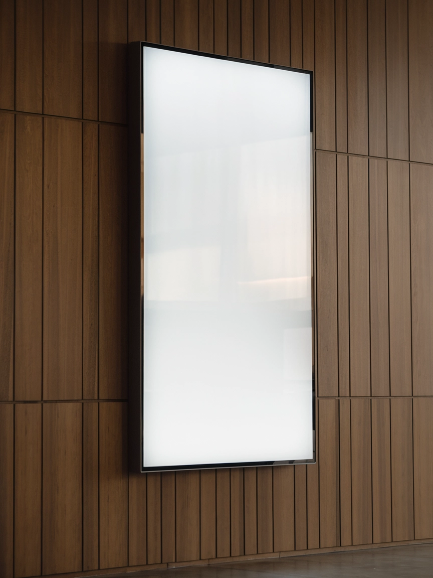 An angled photo from the left of a vertical blank digital screen mounted on a wooden wall inside a modern interior space. The wood paneling is wide and the same width and warm brown, creating a cozy contrast with the bright white of the screen. The lighting is soft, casting gentle shadows and highlighting the texture of the wood. The composition is focused on the screen with a little concrete flooring space around it. The mood is minimalistic and contemporary, suggesting a professional or upscale environment. No direct lighting from above.
