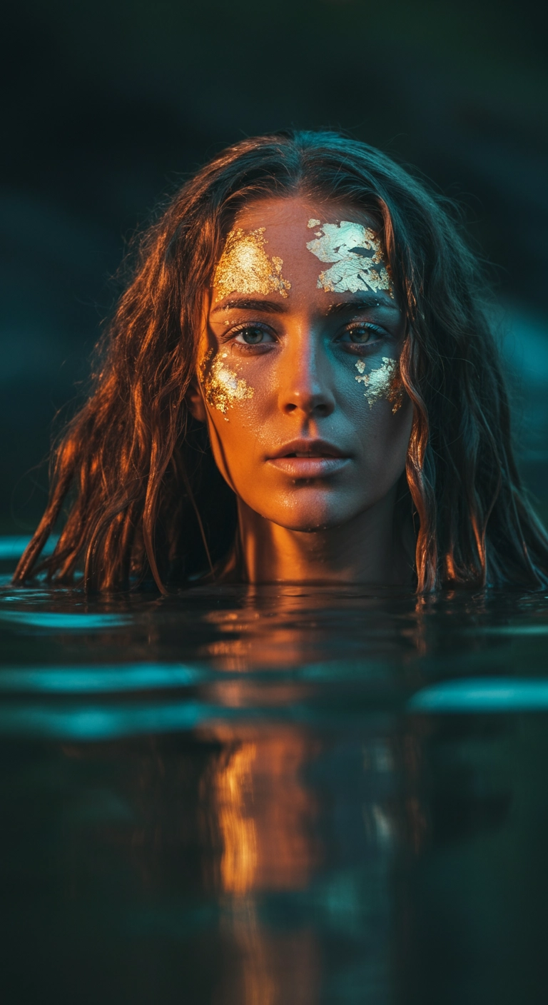 a brave and beautiful futuristic explorer. She is in the wilderness, she is part of the wilderness. Her eyes are open and clear, she is peaceful and strong, there is nothing she can't do. She has metallic teal blue gold leaf and water on her face and is dewy. She is in water. Shot is zoomed out with bokah. Wide angle, zoom out.