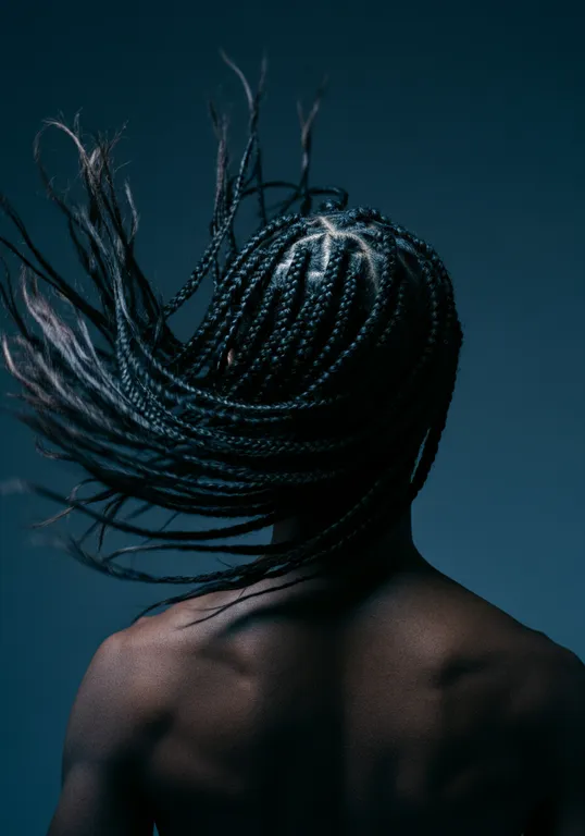 Dynamic portrait of a black person seen from the back, focusing on the dynamic movement of their long, braided hair, which appears suspended mid-air as if caught by a gust of wind.The lighting setup includes a warm, directional key light placed at a low angle from the left side, casting golden tones that illuminate the braids and upper shoulders while creating dramatic shadows. A soft, subtle rim light is added from the right to outline the silhouette and enhance depth. Gradient Blue background. Motion blur. Kodak film. Portra 400. Noise texture. Motion blur.