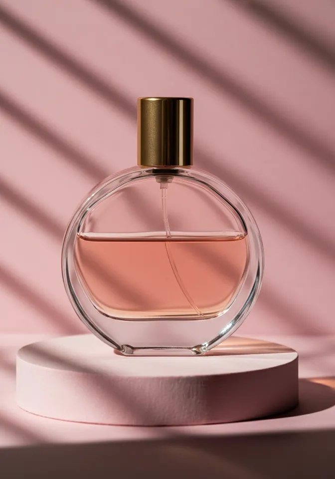 "Close-up shot of a round glass perfume bottle with a golden cylindrical cap, placed on a geometric pink pedestal. The bottle contains a soft pink liquid and has a clean, minimalist appearance with no visible text or branding on the glass. The background features a pastel pink gradient, complementing the elegant and sophisticated aesthetic. Soft, diffused lighting enhances the transparency of the glass, creating gentle highlights and reflections. The geometric pedestal adds a modern and artistic touch to the composition. The image is captured with a high-resolution DSLR camera and a 50mm lens, ensuring sharp details and a visually appealing result.