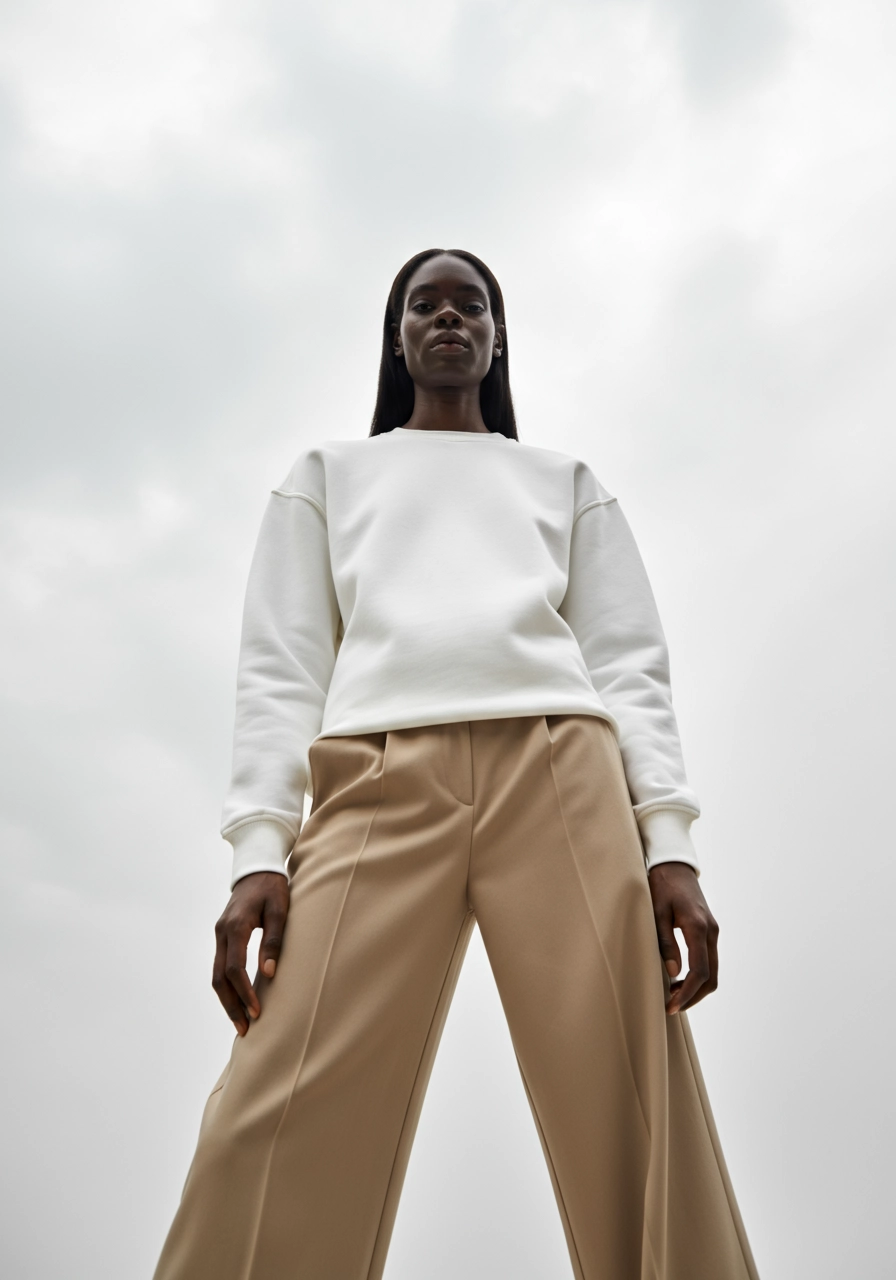Feet to head, full-body shot, low-angle premium brand photoshoot of a stunning Black model wearing a white sweatshirt, with an unobstructed front view ensuring the garment’s details remain fully visible. The low-angle perspective enhances power, dominance, and grandeur, making the sweatshirt the centerpiece of the image. She pairs it with structured beige wide-leg trousers, adding a refined, modern contrast. Her long, sleek hair cascades down her back, keeping the sweatshirt’s front unobstructed. The high-end, editorial shoot features soft, directional lighting, highlighting the texture and drape of the fabric in an UHD, high-resolution composition that captures an effortlessly sophisticated fashion aesthetic