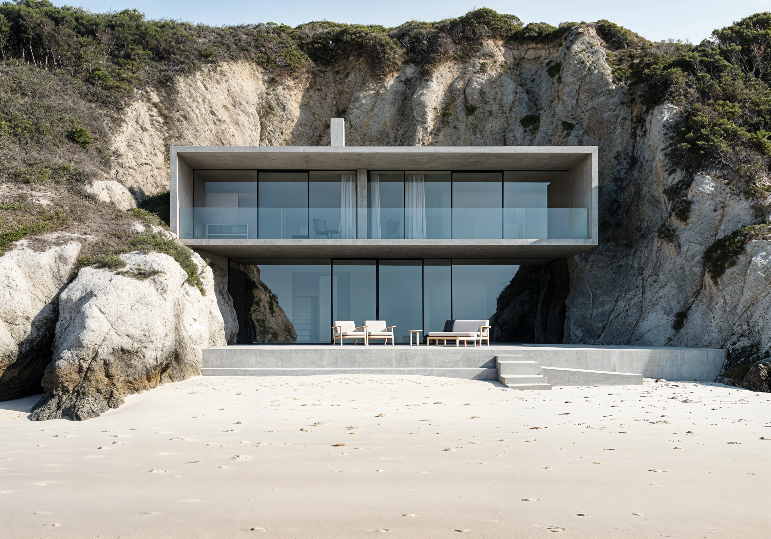 A modern architectural structure is embedded into a rocky cliff face, featuring minimalist concrete design. The building has a sleek, flat roof and large glass windows, creating an open and airy feel. In front of the structure, there's minimalist outdoor furniture set on a concrete patio. The setting is a rugged, natural beach landscape, with lots of white sand, and a harmonious atmosphere. The perspective is slightly angled, showcasing the seamless integration of architecture and nature.