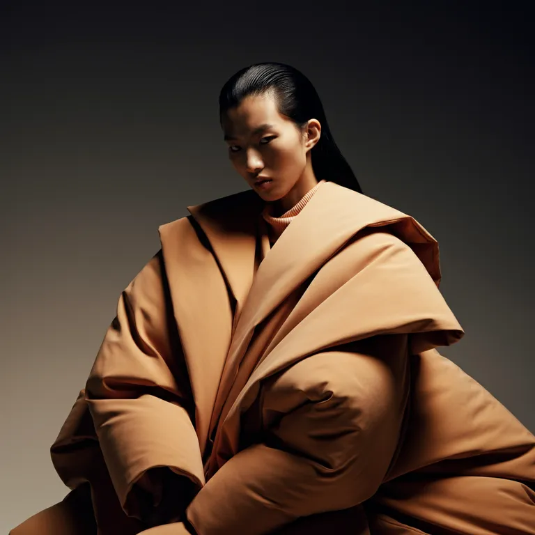 hyper-detailed surreal 32k avant-garde fine details, full body vogue editorial fashion portrait featuring a bold, androgynous model with sleek back dark hair. The model pose dynamically in draped geometrical stiff haute couture by Fear of God, accompanied by a female model shown in an angular body position with dark shadows on the side of her body. Sharp edges puffer stiff fabric haute couture by fear of god, renaissance dropped geometric oversized haute couture. Son, sootinun: trom above enhances the detailed texture of the skin, creating subtle highlights and shadow gradients. The background is a dark moody gradient of deep greige, fading softly to black, ensuring focus on the models' striking forms. The atmosphere is dark, moody, and artistic, evoking a timeless sense of modern elegance.