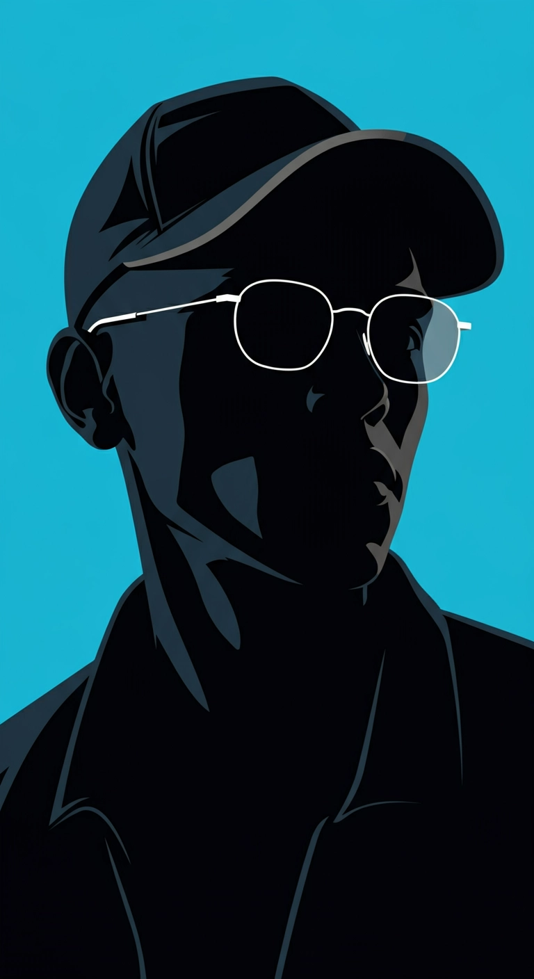 The image features a bold silhouette of a man against a vibrant blue background. The outline of the silhouette is defined, revealing a baseball cap on a bald head, adding texture to the silhouette. The most eye-catching detail is a pair of thin silver framed sunglasses that stand out against the man's dark face, creating a chic and modern look. The minimalist, bold use of color and silhouette gives the image a modern, artistic, hip-hop feel, highlighting the contrast between shadow and light.