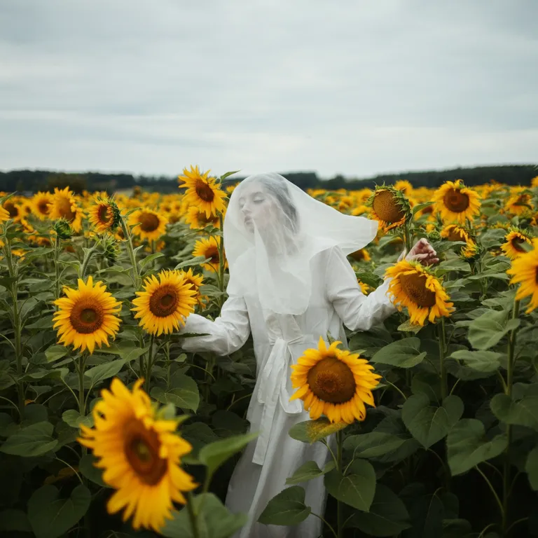 a ghost woman in a field of sunflowers, on a cloudy day, further away from the camera and centered