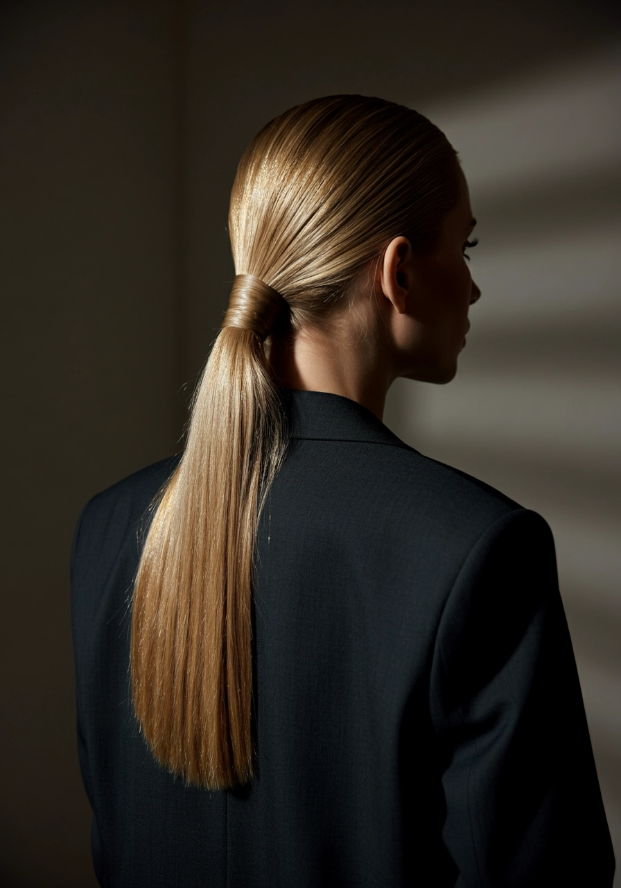 A back view of a woman with long, straight blonde hair tied in a sleek low ponytail, wearing a dark tailored blazer. Soft diffused lighting highlights the hair's smooth texture and the sophisticated silhouette of the outfit. Minimalistic blurred background for a clean and elegant composition.
