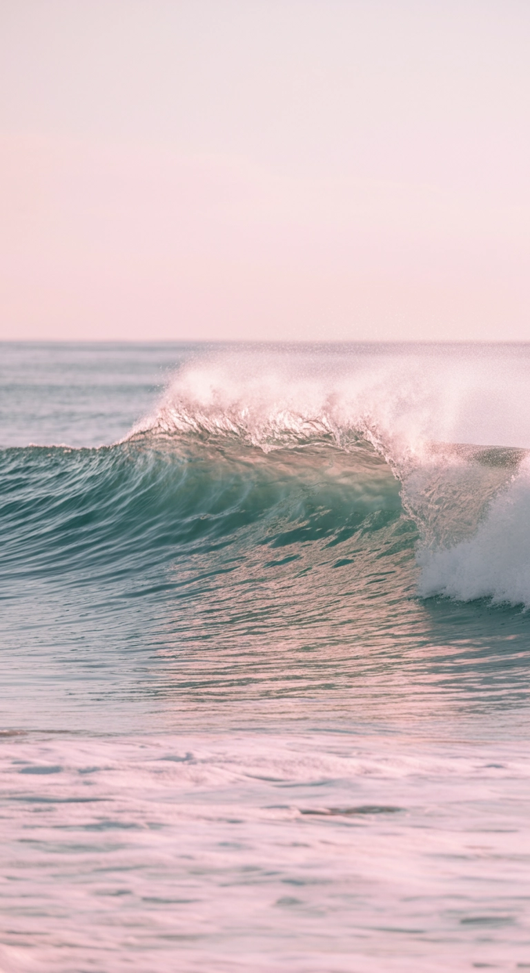 pastel pink ocean wave under a soft sunset light, dreamy seascape