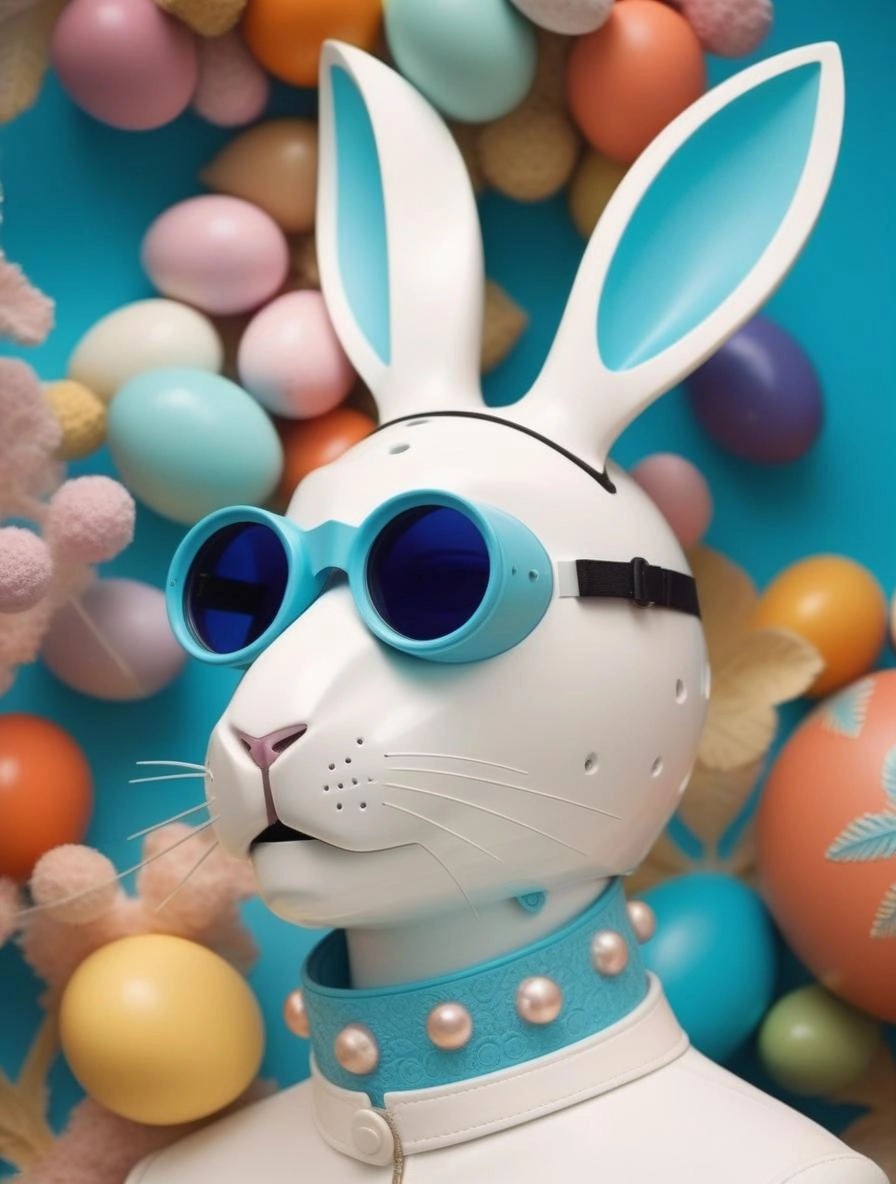 3d close up profile render of a retro futuristic robot covered wearing quirky goggles and a whimsical oversized rabbit Helmet with fractal decorations, wearing Mandelbrot fractal embroidered attire , against a Colorful Fractal background of Easter Eggs and Palm Leaves