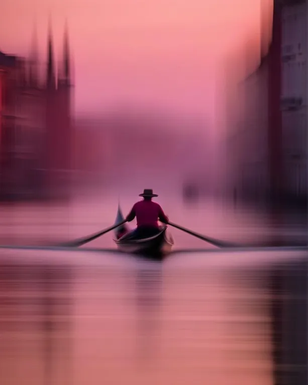 a Venetian gondolier rowing a gondola through a narrow, peaceful canal under a twilight sky