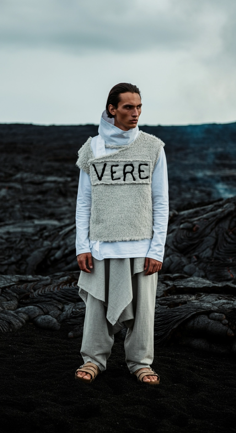 A white-skinned man model against the backdrop of black lava in volcano Ijen on the Java island, dressed in man clothing with minimalistic modern Japanese motifs. He is wearing a white-gray shirt with long sleeve made of natural fabrics with an organic print pattern in form melted the small letters “VERE” sewn on top of a fluffy white cloth shirt, an asymmetric cut, and loose oversize pants that emphasize a unique style. The atmosphere is storm, with a hard sea breeze flowing through the clothes.