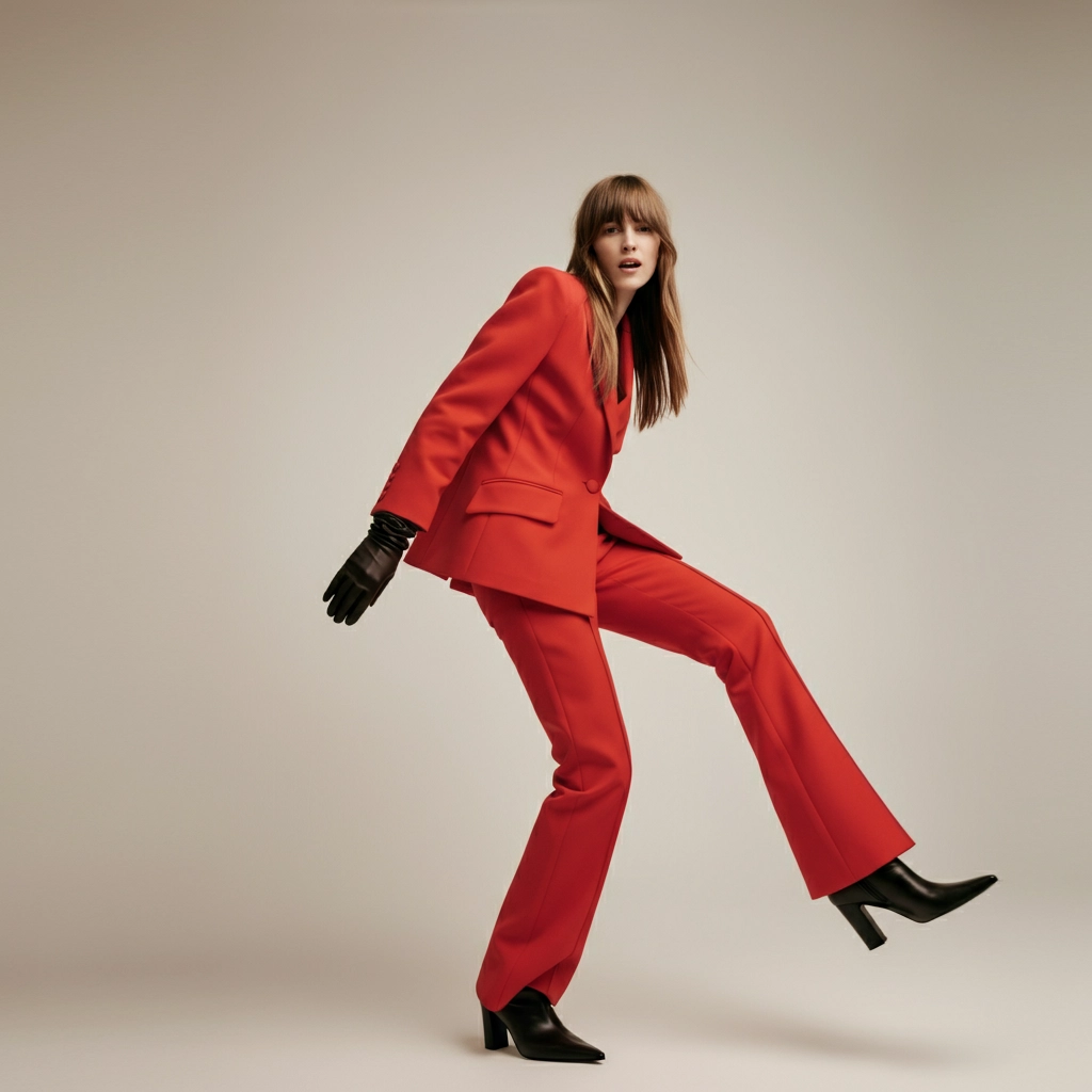 A woman posing in a minimalist studio wearing a vibrant red pantsuit with a tailored jacket and flared trousers. The jacket features oversized lapels and modern details. She is accessorized with black gloves and sleek, pointed black heeled boots. Her hair is straight and loose. The pose is dynamic and playful, with one leg lifted high, showcasing movement and energy. The background is neutral, with soft lighting and a modern editorial photography style. in a Jacquemus style