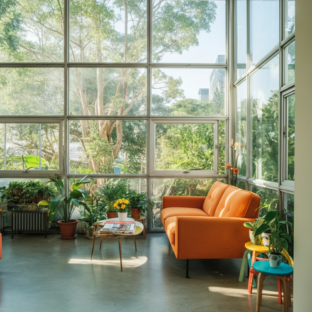 Modern Living Room: Primarily furnished with modern furniture, the walls are made from glass and metal, creating a contemporary and minimalist atmosphere. On sunny days, open up the windows to fill the room with sunlight and vibrancy.