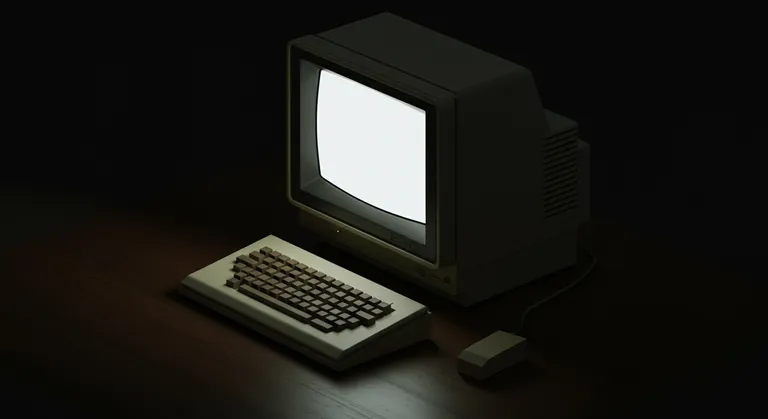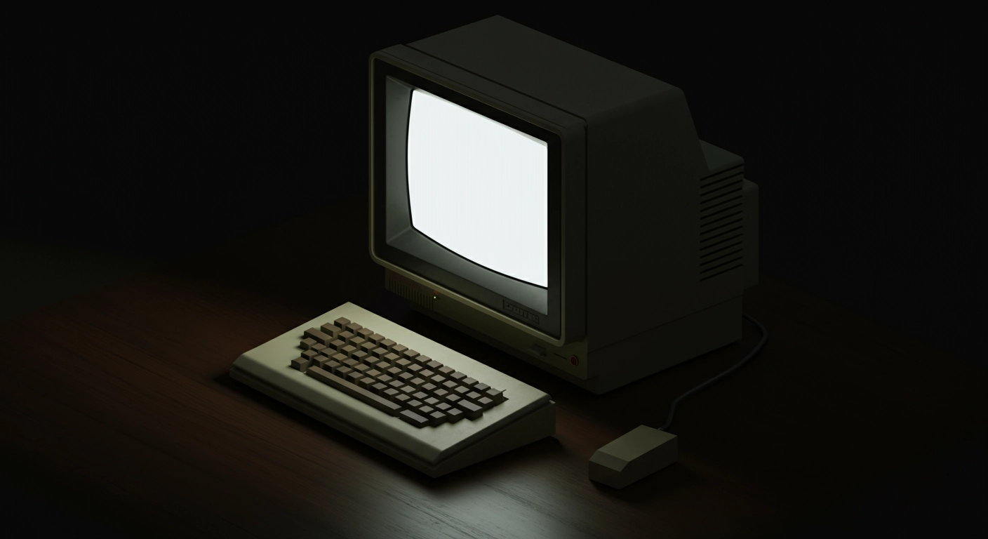 Create an image of a vintage-style personal computer from the 1980s. The computer should feature a bulky monitor with a large, nearly square screen surrounded by a dark bezel. Below the monitor, include a keyboard with distinctly aligned keys. The computer should be placed on a dark surface, possibly wooden, in a very dimly lit setting, with the screen as the only light source, casting a soft ambient glow. The background should be nearly pitch black, emphasizing the silhouette and the glowing screen of the computer. Aim for a minimalist and slightly mysterious aesthetic, evoking a nostalgic and moody atmosphere.