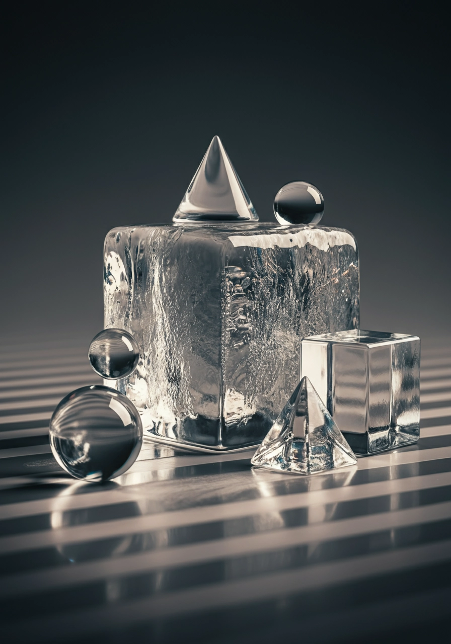 Holographic sculpture of an ice coon on white background with graphical black and white stripe pattern. The scultpure conists of geometric 3D forms: 3 spheres, 2 triangles, 1 cube and 1 coon. The coon has a subtile waffle structure while the other shapes have a flat very refective surface.