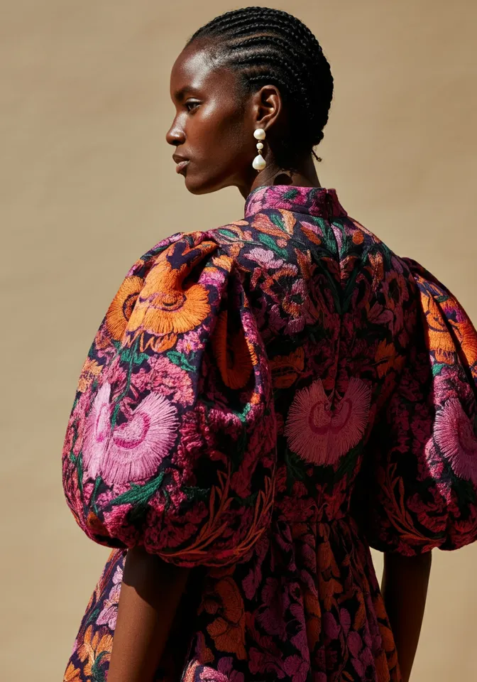 A women wearing a patterned, embroidered dress with intricate floral designs in vibrant colors, including pink, orange, and purple. The dress features voluminous sleeves and a high collar. The model has neatly braided hair and wears pearl earrings. They are positioned against a plain beige background, creating a minimalistic setting. The image is captured from a side angle, focusing on the garment's elaborate patterns. The soft lighting enhances the richness of the fabric's design, conveying a sophisticated and artistic atmosphere.