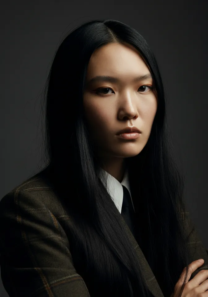 young 20s Asian powerful woman portrait with a Wes Anderson look, long black hair, fashion style, strong contrasts, bold colors, confident expression, striking composition, portrait photography