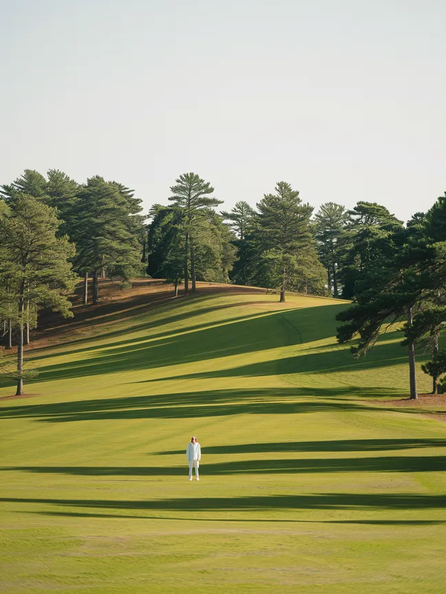 A solitary figure stands on a vast, rolling grassy hillside with Augusta National Pine trees in the background. The person is dressed in light-white clothing, creating a subtle contrast against the expansive green landscape. The background features gentle green gradients of the hills. The lighting is natural and even, emphasizing the lushness of the grass. The composition presents a wide-angle perspective, conveying a sense of isolation and tranquility. The mood is serene and contemplative, suggesting a moment of peaceful solitude amidst nature's vastness.