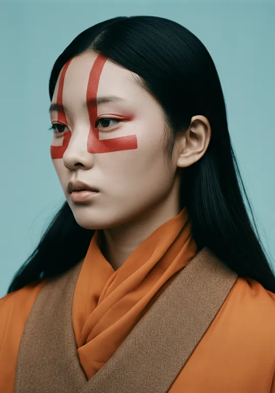 A photograph of an Asian woman with red stripes on her face, wearing a minimalist fashion style, against a light blue background. The image showcases a minimalist photography style, with a combination of light gray and dark orange tones. The portrait is a close-up, with a symmetrical composition, giving it an editorial magazine shoot aesthetic. The detailed facial features of the subject are prominently displayed.