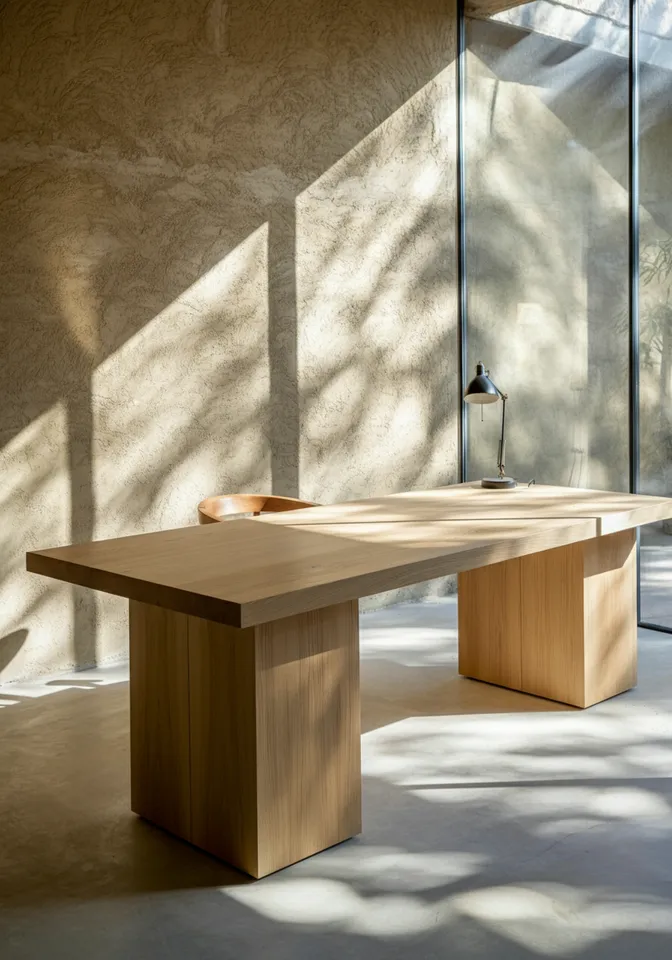 Wide-angle shot of a serene, light-filled workspace with a massive custom-built white oak desk as the central focus. The desk’s monolithic form features thick, solid panels and smooth, hand-finished surfaces that reveal subtle variations in the wood grain. Its proportions are bold yet elegant, with clean lines and a sturdy silhouette that exudes craftsmanship and permanence. The desk’s surface is bare, allowing its natural beauty to take center stage, with faint highlights of sunlight emphasizing the rich, golden hue of the white oak. Soft natural light streams through a large floor-to-ceiling window, casting long, gentle shadows across the chukum stucco walls, creating a harmonious contrast between the rough, matte texture of the walls and the warm, organic smoothness of the desk. The room is devoid of any chairs or distractions, allowing the space to feel open and contemplative—a quiet celebration of form and materiality, inspired by the monolithic and serene design principles of Luis Barragán.